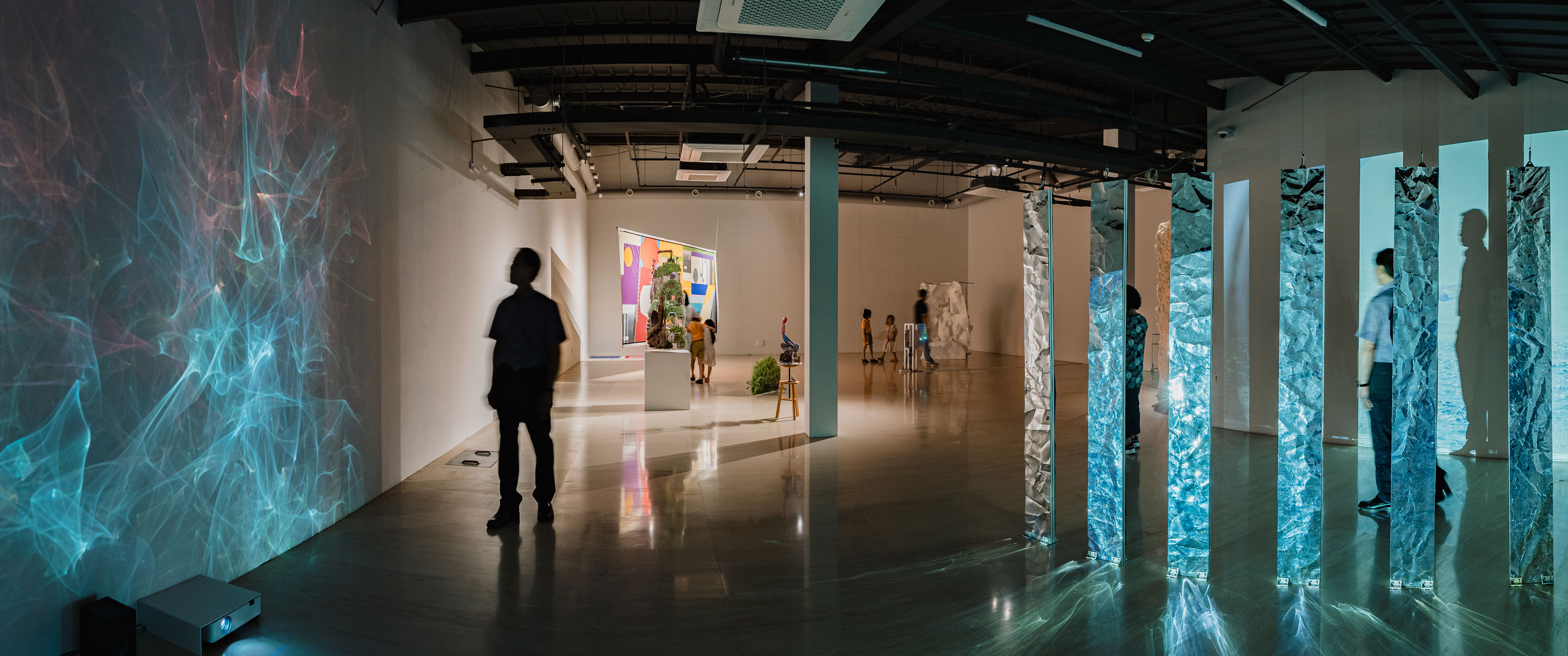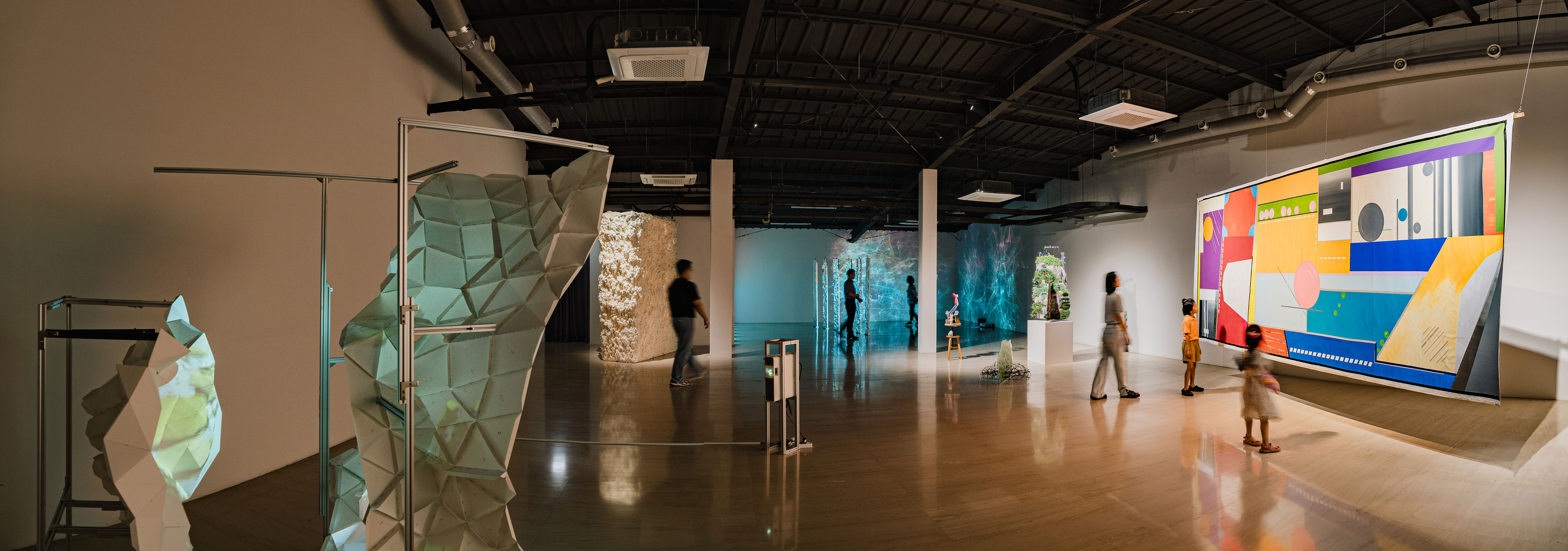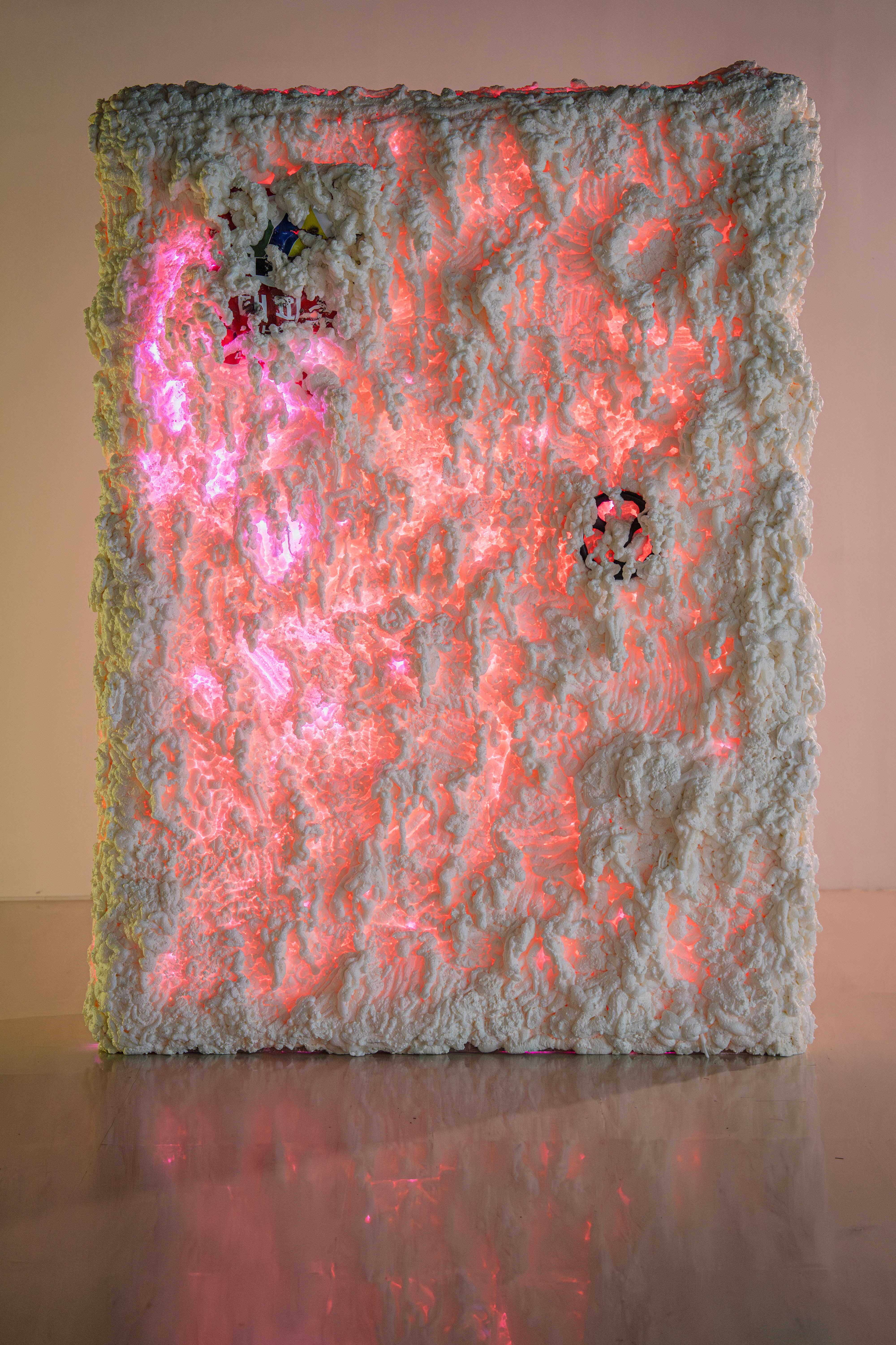 첫 번째로 아트플러그 연수 전시공간에 들어서자마자 관객을 가로 막는 박현철 작가의 대형 작품 <monólimen>은 낯선 출입구(포털)로서 붉은 빛을 불규칙하게 내면에서 뿜어내며 하얀 우레탄 소재가 겉면에서 수없이 오랜 세월동안 흐르고 있는 듯이 두텁게 봉인되어 출입구로 더 이상 기능을 상실한 형상을 자아낸다. 이는 평소 가죽, 갈대 등 자연소재로 생명체가 완성되기 전 중간 과정에 관심을 두고 시원적 형상을 자기만의 꿰매기와 조립으로 동식물을 ‘덜 만들어내는데’ 특이점을 돋보여온 박현철 작가의 작품이다. 박현철 작가가 백령도 바닷가에서 발견한 대피소를 보며 떠올린 영화 《2001:스페이스 오딧세이》에서 ‘모노리스’라는 제 3의 생명체가 만든 도구지만 목적을 알 수 없는 신비의 사물에서 영감을 받아 제작한 작품으로, 작가가 말하는 ‘자메뷰(jamais vu)’, 우리말로는 결코 본 적 없는 ‘생경함’을 표현했다고 한다. 예술의 탄생 이래 여러 사조가 단절되고 기존 양식의 해체를 일삼지만 여전히 놀라움의 법칙만은 쫓고 있는 동시대미술의 전시장 초입에서 만난 낯선 포털의 대형 오브제는 제목과 반어적으로 전시장으로 우리를 들여다 놓는다. 그 포털은 송하영 작가의 거대한 색면 추상화와 직면하게 이어주며, 양 옆으로 정성진 작가의 프로젝션 설치 작품과 강정민 작가의 이미지 오브제들, 마지막으로 공은택 작가의 환영 작품 공간으로 이동시키는 등 이번 전시의 큰 호흡은 이렇듯 작동하지 않을 것 같은 포털 작품을 매개로 트인 공간 속으로 들어가서 장막 없이 배열되어있는 작품들을 마주하는 박자감을 가지고 있다.