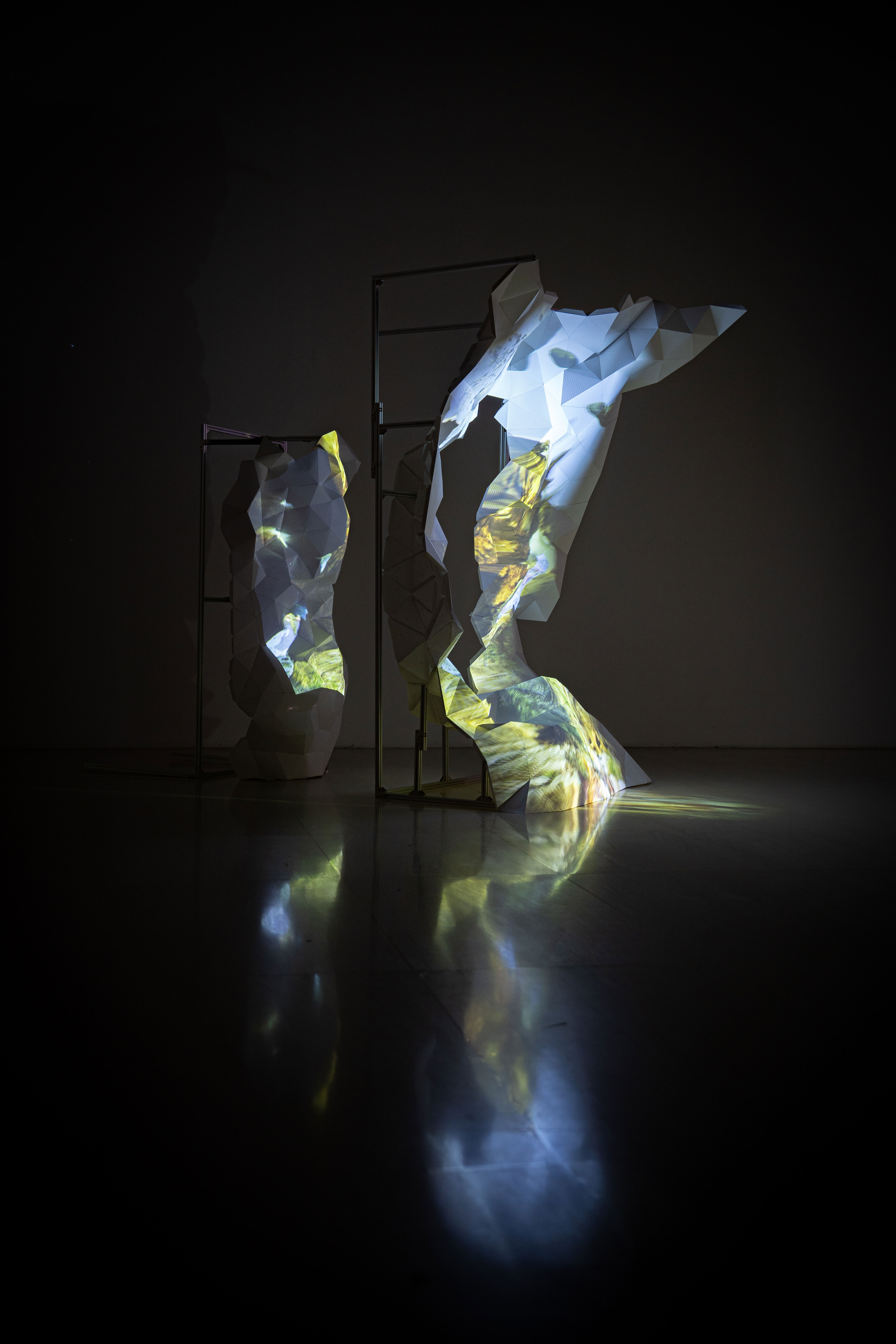 백령도는 거센 파도와 바람으로 특유의 지층과 암석을 가지고 있는데 이에 주목한 정성진 작가는 그 암석을 종이 조형물로 재현하여 , 기존의 작업방식인 꿈에서 본 가상 이미지를 컴퓨터 프로그램을 통해 구현하는 방식이 아닌 , 실존하는 풍경을 새의 시선으로 비행하여 본 백령도의 자연환경을 투사한 프로젝션 설치작품 < 경로이탈 > 을 선보인다 . 우리가 볼 수 없는 차원에서 백령도를 다시 바라보는 시선의 이미지를 흰 종이로 만든 축소 암석물에 투영시켜 인간차원에서 이탈한 시선을 시각화한다 . 인간이 새의 시선을 갖기 위해 신체를 날 수 있는 기계에 태우거나 기계의 눈으로 촬영을 해서 본다면 아주 불가능한 일도 아닌 세상이지만 새의 눈으로 백령도를 본다는 작가의 상상은 자유로운 신체를 갈망하는 인간의 일차원적인 욕망으로 느껴진다 .