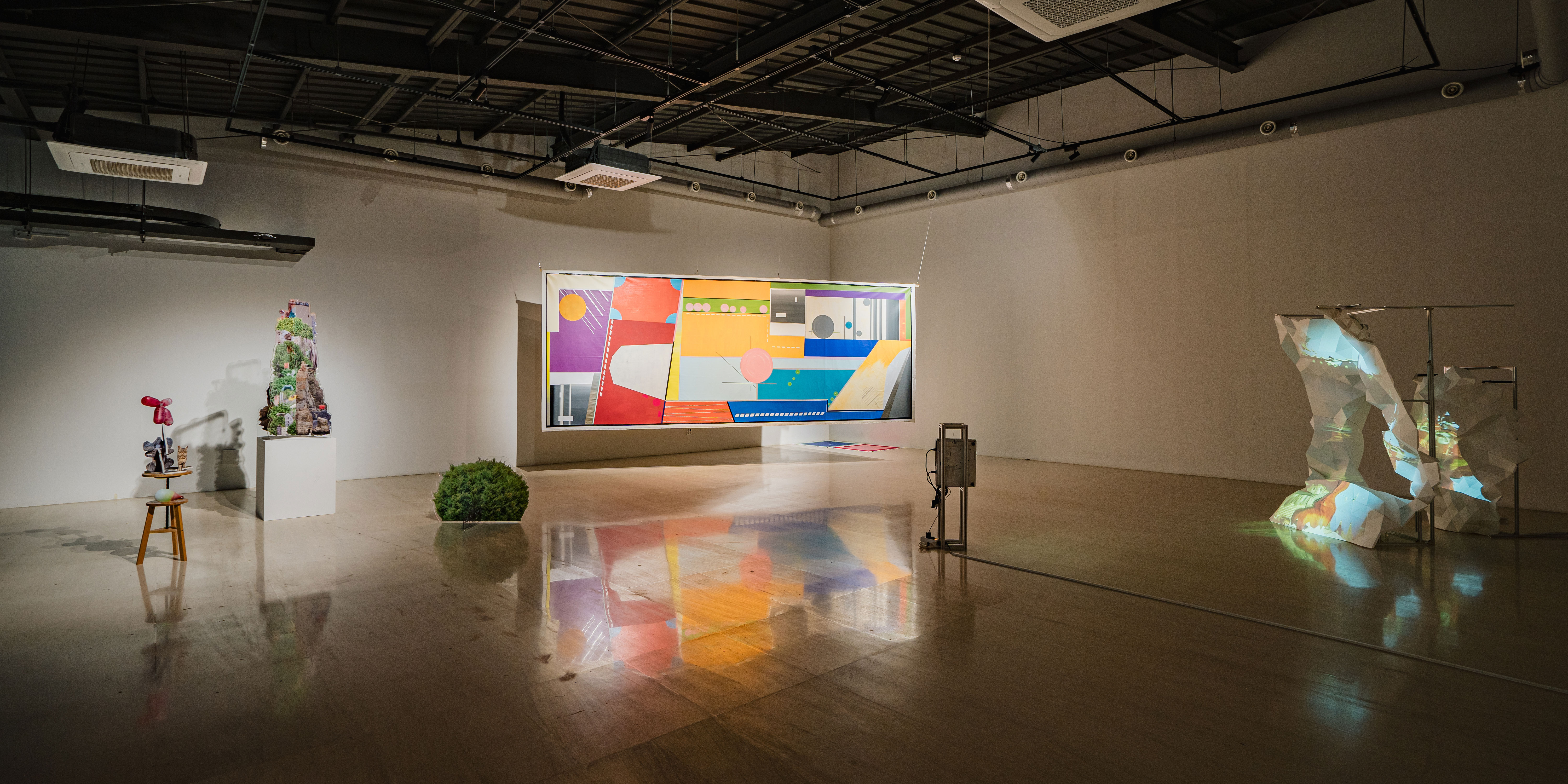 포털 작업을 뒤로 송하영 작가의 거대한 색면 회화작품 <공감각 회로>로 끌려가 들여다보자면, 단단하게 겹겹의 색들을 쌓아올려 여러 색면 회화 조각들이 각 틀 거리를 감싸며 입체차원으로 이동하여 조합될 때 또 다른 형상을 자아내고, 틀 너머 다른 틀들과 다른 색들로 접속 가능하던 개방적인 틀 개념을 강구해오던 송하영 작가의 기존 작업과 다른 작품을 발견할 수 있다. 오히려 이번 작품은 가로 6미터, 세로 2.3미터에 다다르며 한 장의 대형 캔버스로 단면 속에서 색과 선의 힘으로 경계 지어지고 오히려 그 안에서 흐릿한 틀들로 해체되면서 다른 색들과 개방되어 연합하고 가장 외곽의 평면차원 안에서 입체성을 구현해내는 회화의 다른 현상들이 발견된다. 작가 특유의 추상적 이미지 기법은 백령도 지층에서 영감을 받아 평면 차원에서 응집되어 선, 색, 면들로 수집되어 다른 풍경화로 표현해 놓는다.